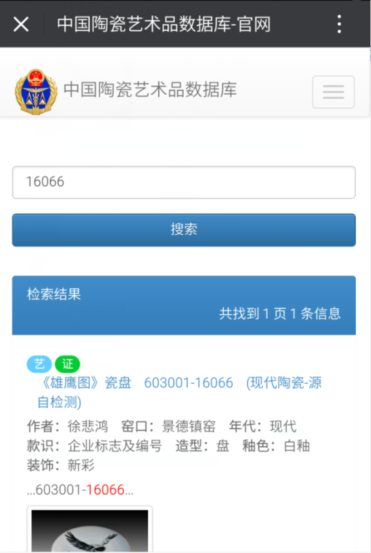 2、進(jìn)入中國陶瓷藝術(shù)品數(shù)據(jù)庫官網(wǎng)頁面,在圖二的選中區(qū)域輸入圖一中產(chǎn)品編號后五位數(shù)字“16066”,即可檢索到該編號產(chǎn)品可供對外查詢信息(每個產(chǎn)品對外可查詢一個體視顯微鏡照片數(shù)據(jù))
