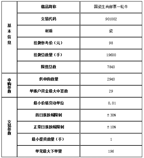 經(jīng)景德鎮(zhèn)陶瓷交易所有限公司(以下稱本交易所)發(fā)行會員申請,本交易所專家委員會、新藏品掛牌審核小組評估審核通過,對已經(jīng)完成托管入庫的藏品《國瓷生肖郵票一輪牛》準(zhǔn)予在本交易所線上實物交易系統(tǒng)正式掛牌交易,具體事項公告如下: