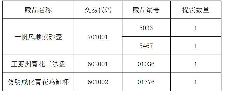 2016170關(guān)于交易藏品《一帆風(fēng)順紫砂壺》等提貨公告