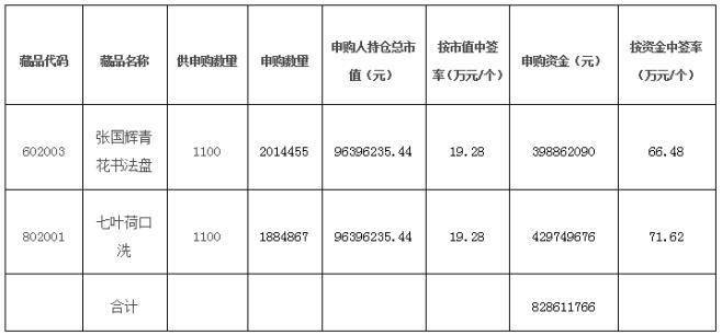 本次中簽分配方式為45.45%按持倉(cāng)市值分配,54.55%按申購(gòu)資金分配,請(qǐng)廣大參與申購(gòu)的交易會(huì)員關(guān)注交易賬號(hào)中持倉(cāng)數(shù)量和資金變化情況?!稄垏?guó)輝青花書(shū)法盤(pán)》、《七葉荷口洗》將于2017年4月8日正式掛牌交易。